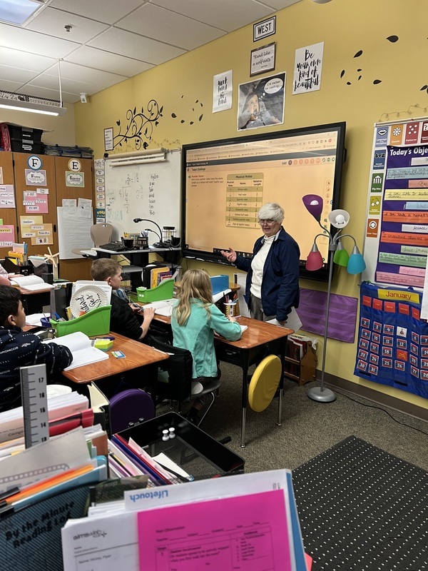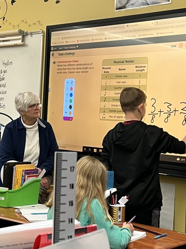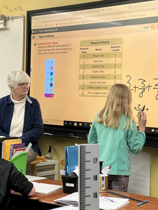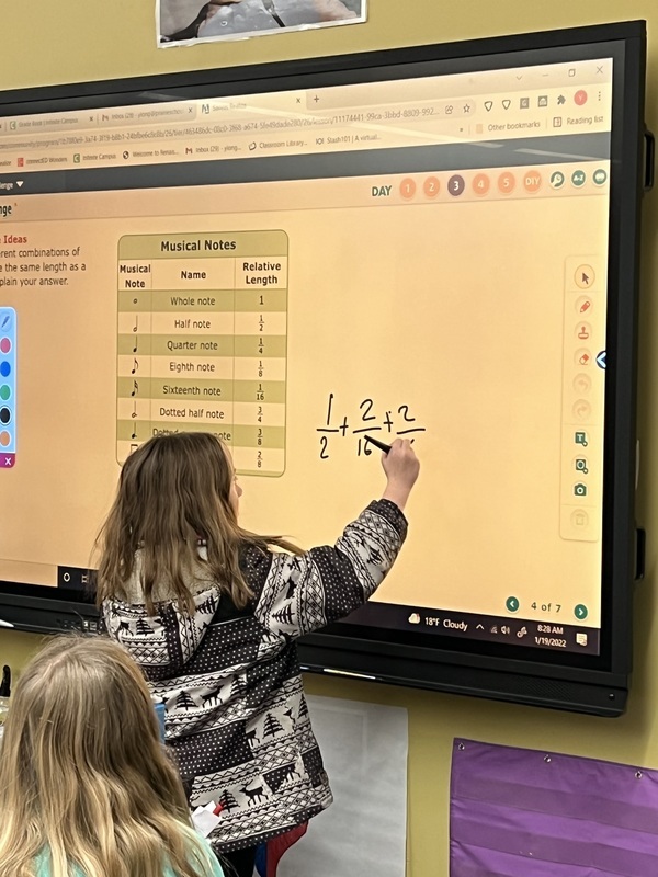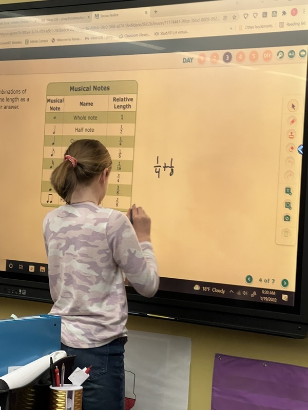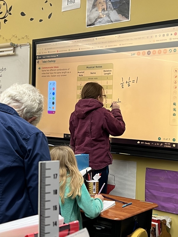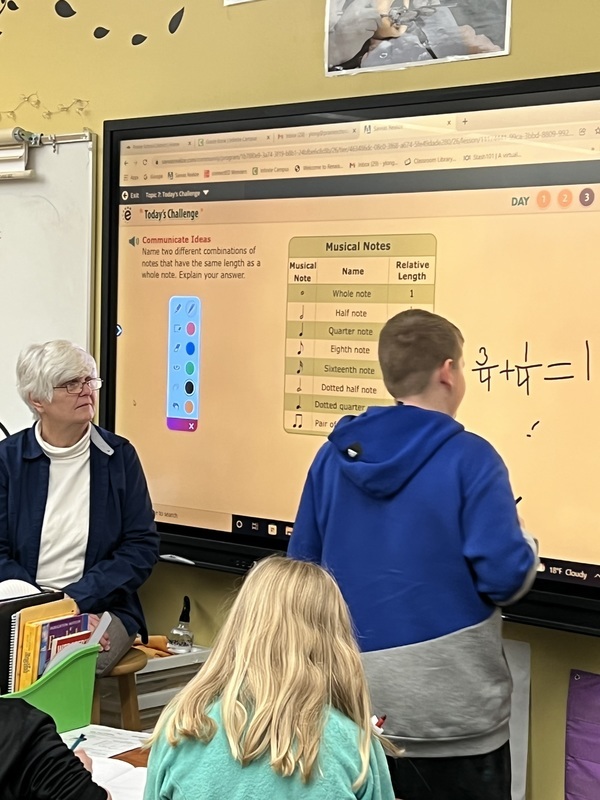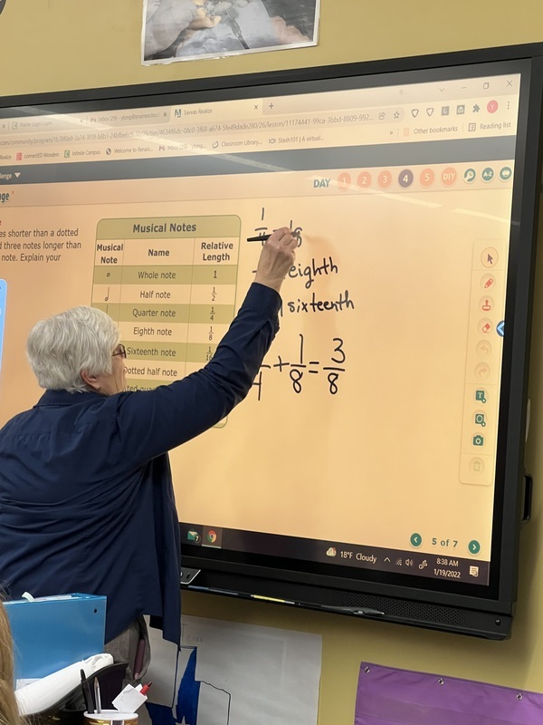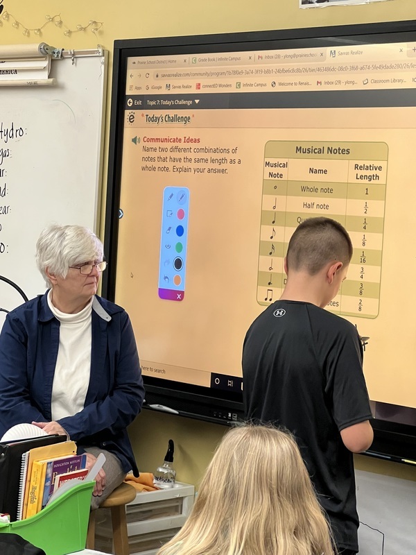 Mrs. Lawson sent the 5th graders to the Promethean board to prove their answers and we had rich math/music conversations. We also made Mrs. Lawson take notes in our Promethean board; she was pretty good at it.