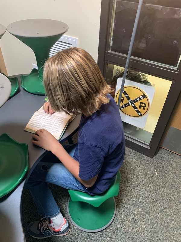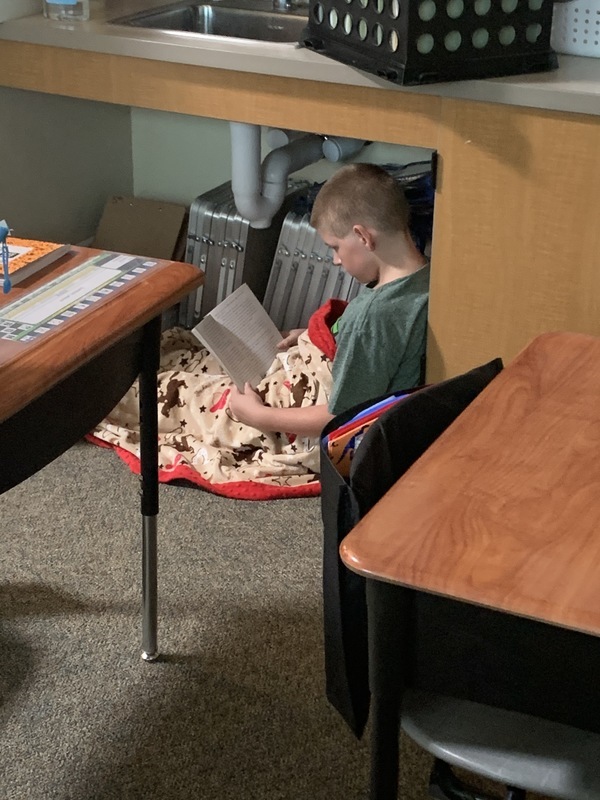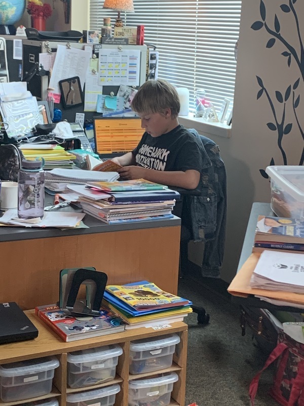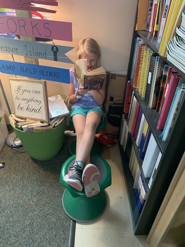 Dominic enjoys sitting in Mrs. Long's chair to read.
